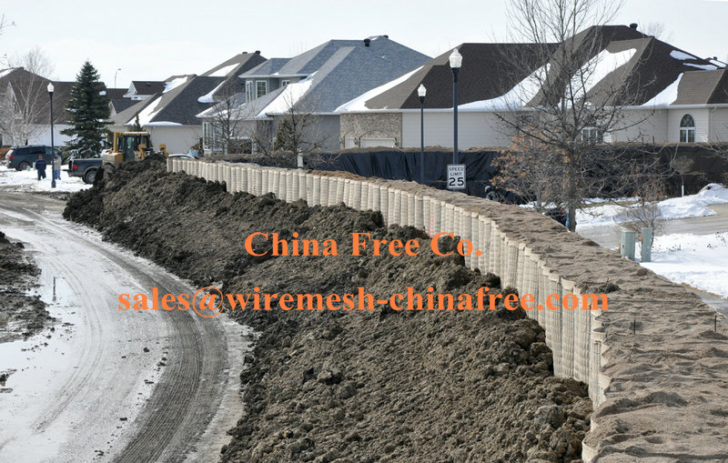 Imagine a steel wire crate, four feet tall and three feet wide, lined with a plastic canvas and then filled with dirt. Line up several of these in a row and you have a quick and sturdy wall.